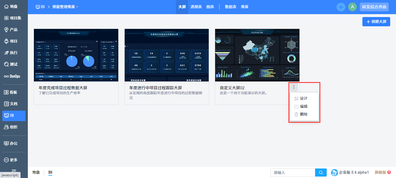 在“BI”-“大屏”的大屏浏览页面中,点击大屏卡片中的更多,可以对大屏进行设计、编辑、删除的操作。