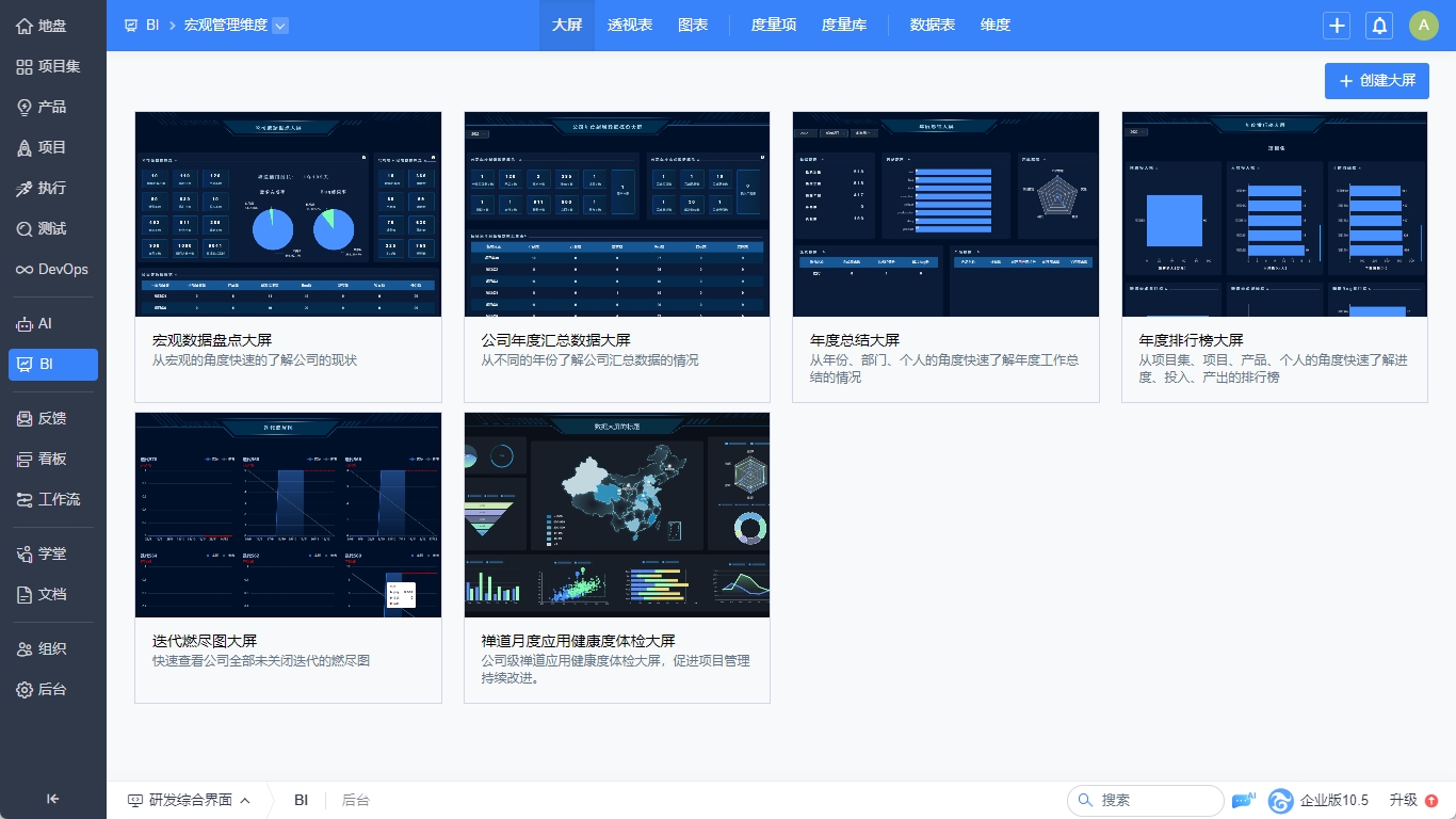 1.宏观管理维度内置5张大屏:宏观数据盘点大屏、公司年度汇总数据大屏、年度总结大屏、年度排行榜大屏、燃尽图大屏和禅道月度应用健康度体检大屏(企业版)。