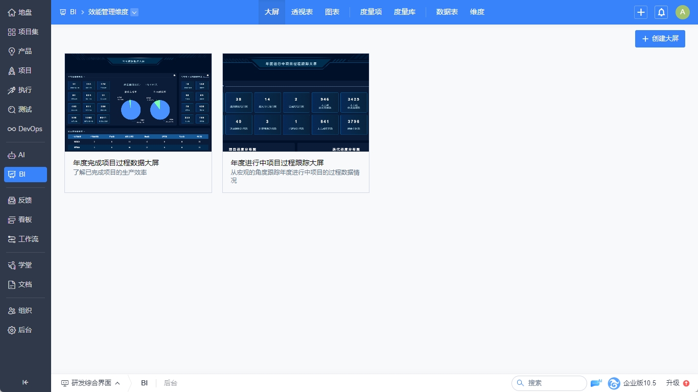 2.效能管理维度内置5张大屏: 年度完成项目过程数据大屏和年度进行中项目过程跟踪大屏。
