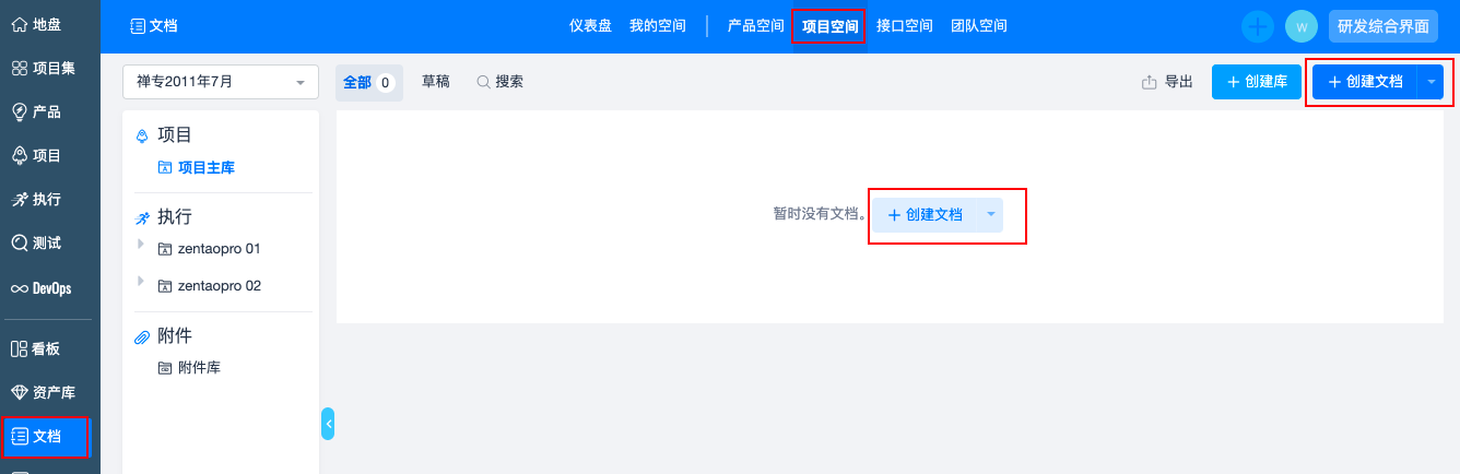 点击文档--项目空间--创建库的按钮,可以选择创建项目库、创建接口库、创建某项目下执行中的执行库。