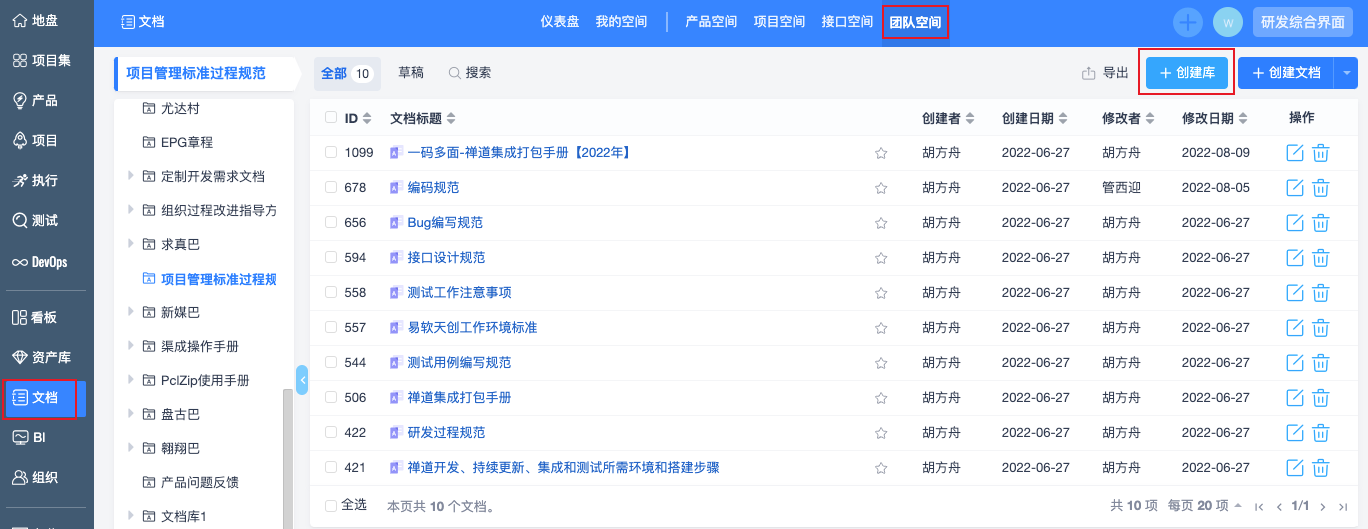 【18.4版本起】文档中新增团队空间,支持在团队空间下创建公开的库和私有库,维护库的同时也可以在库下维护目录和文档。