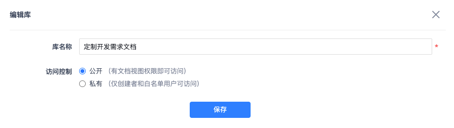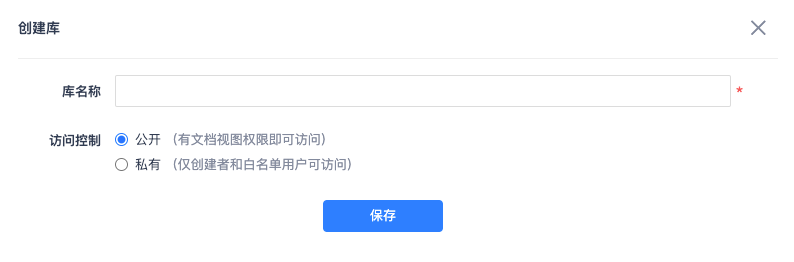 注:库的访问权限默认设置为公开,可以选择私有权限,私有权限支持设置白名单用户。