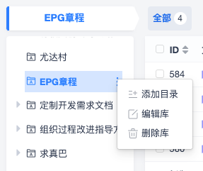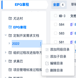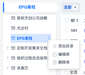 鼠标悬浮到某个库下的文档目录,点击右侧出现的更多按钮,可添加同级目录、添加子目录、编辑目录和删除目录。