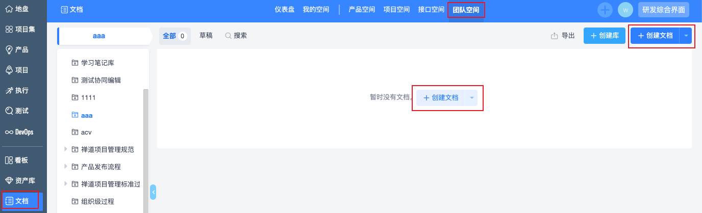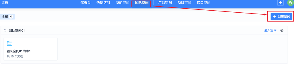 点击文档--团队空间--创建空间的按钮,可以选择创建空间。