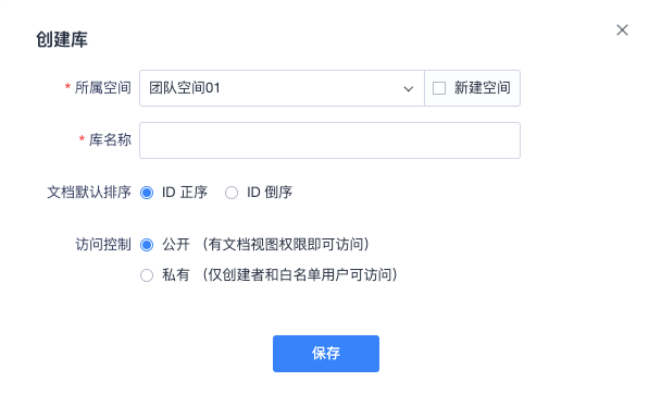 在创建库的弹窗中,可以选择库的所属空间,也可以新建空间。将库创建在对应的空间下。