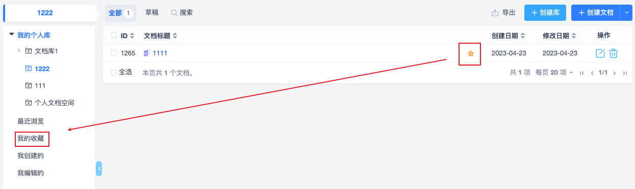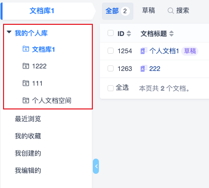 可在文档列表左侧树形导航中查看所有我创建的库和文档目录。
