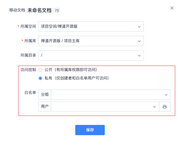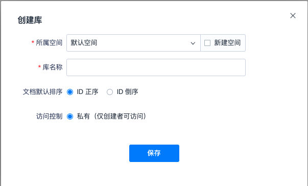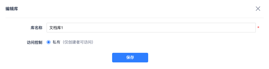 注:库的访问权限仅可以设置为私有,仅创建者可以访问。其他空间下的库可以设置对应的权限。