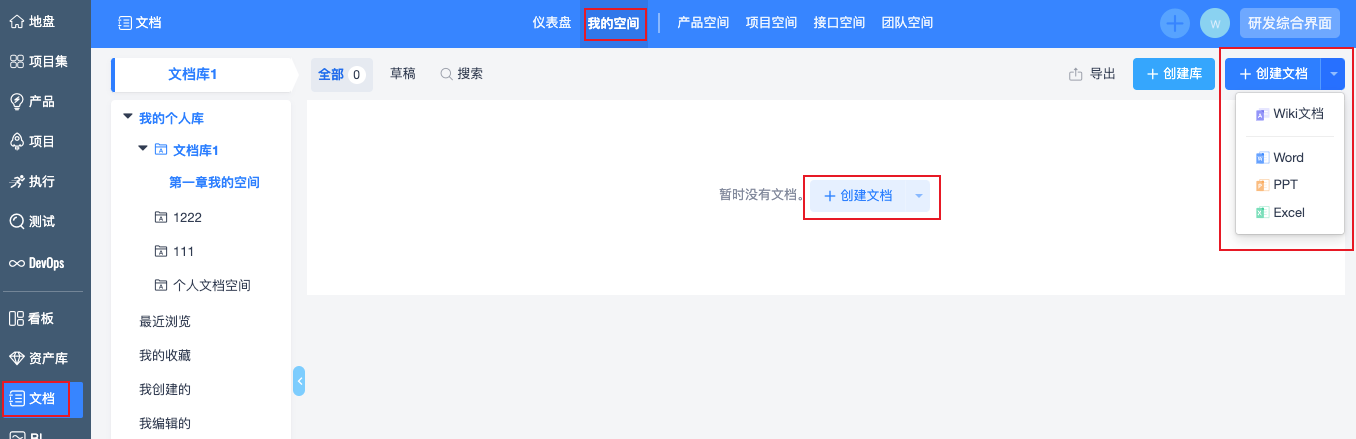 【18.4版本起】文档中新增我的空间,支持在我的空间下创建和维护私有库,也可以在库下维护目录和文档。