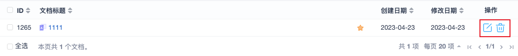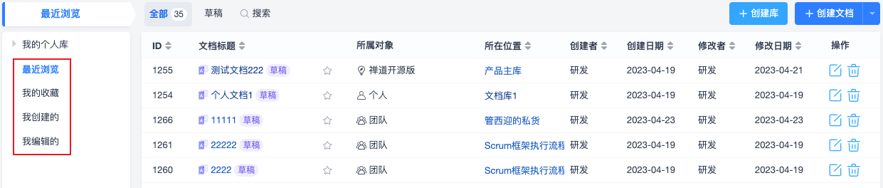 在我的空间中,支持查看最近浏览、我的收藏、我创建的和我编辑的,在右侧文档列表中显示,同样也支持编辑和删除操作。