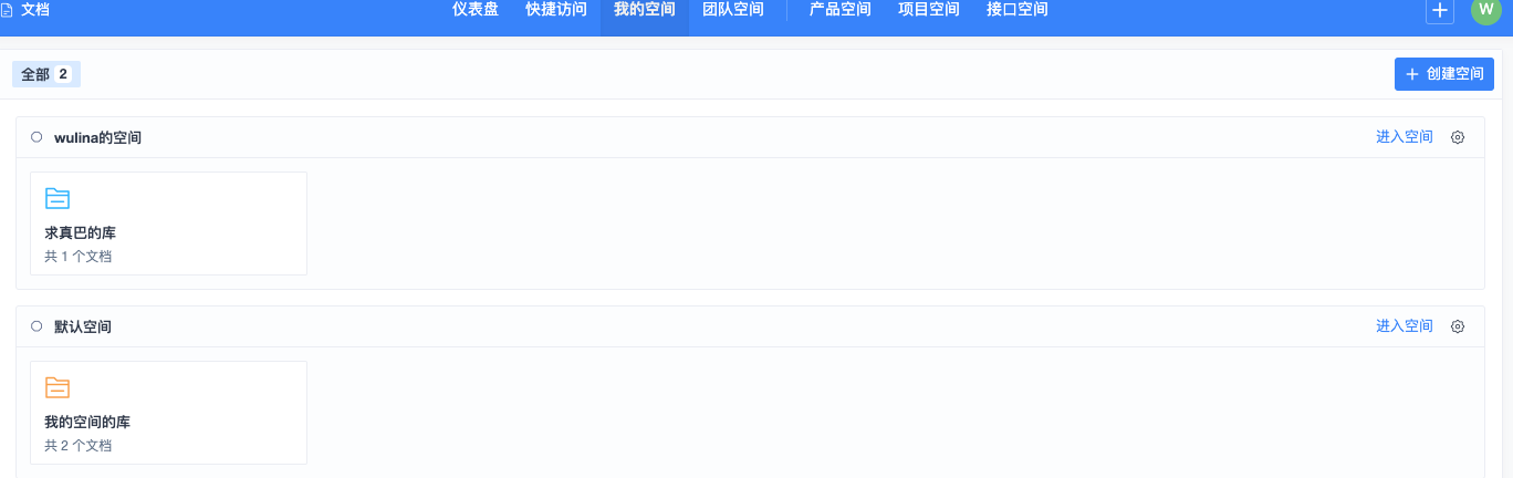 点击二级导航我的空间,进入我的空间的首页,可以查看已创建的空间以及空间下的部分库,可以点击进入空间,进入到详情中,查看所有库。