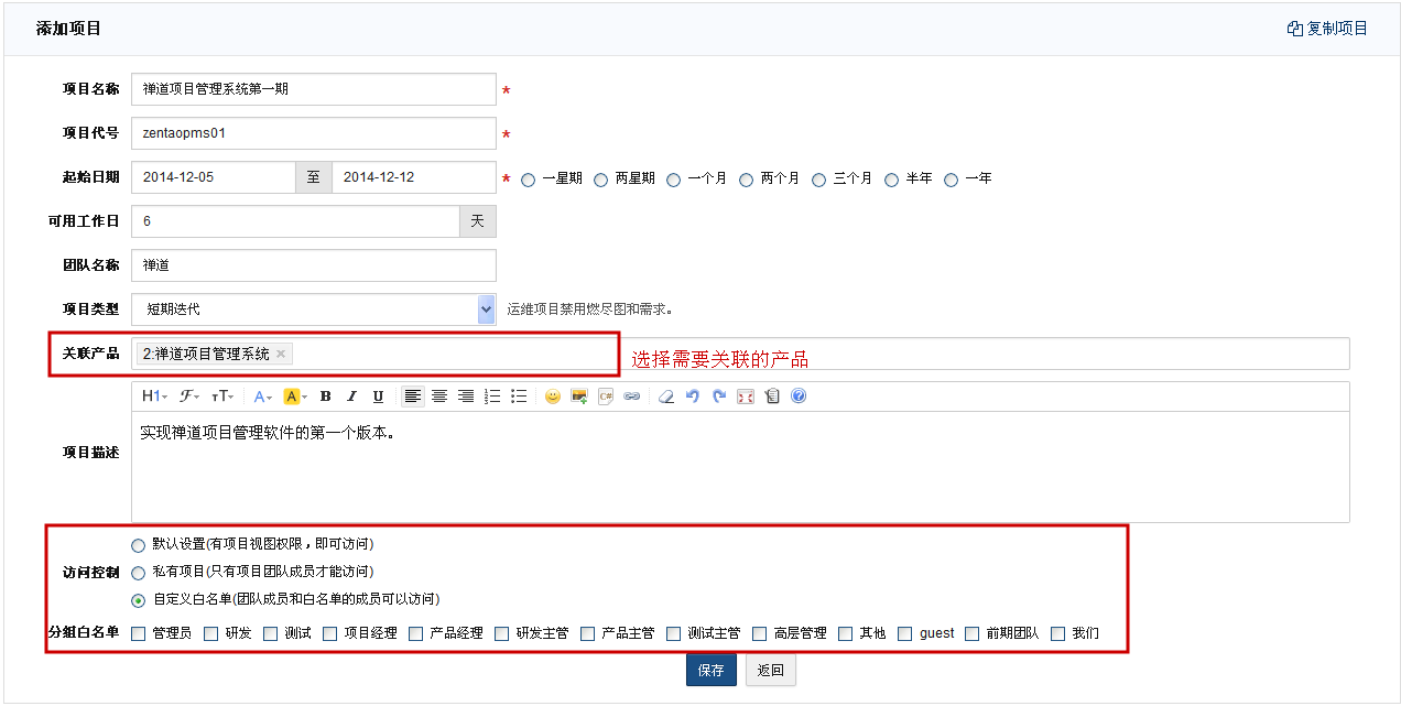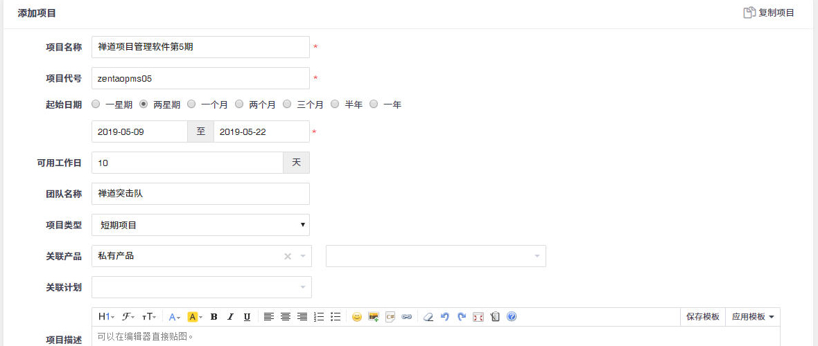 进入项目添加的页面后,在这个页面设置项目名称、代号、起止时间、可用工作日、团队名称、项目目标和项目描述等字段。其中关联产品是可以为空的。