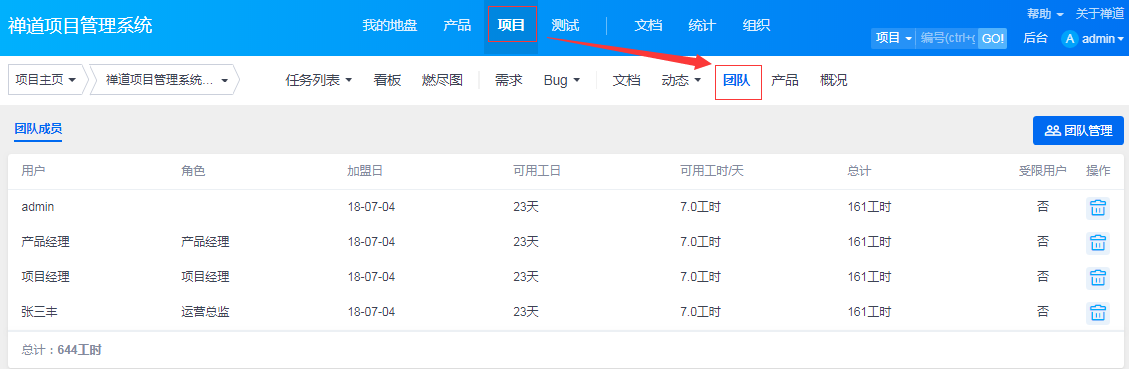 创建项目点击保存按钮,会提示项目创建成功,然后可以选择设置团队。或者从项目视图中的团队菜单,也可以进行项目的团队管理。