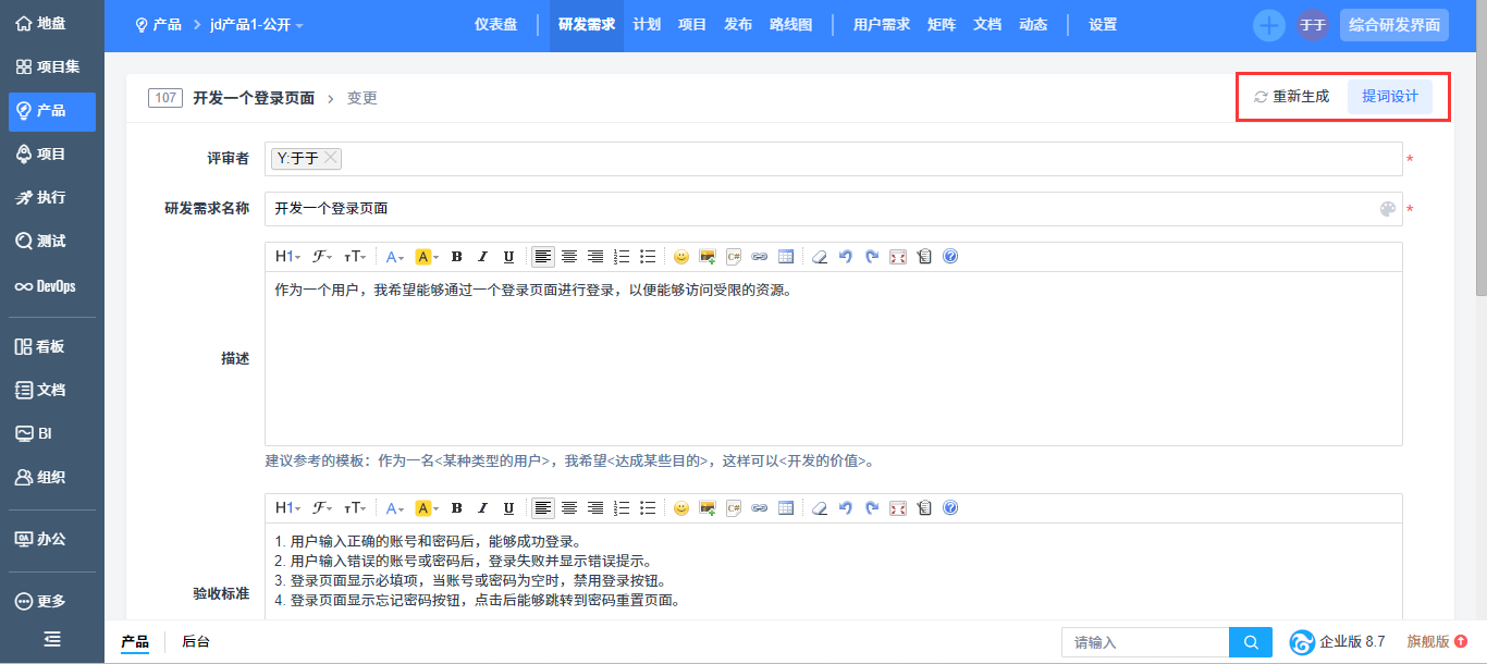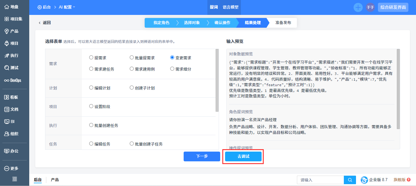 在提词设计器结果处理表单、提词列表操作栏和提词对象页中,点击去调试按钮,可以对未发布的提词进行调试,调试后可重新生成结果,返回结果令用户满意后即可发布提词。