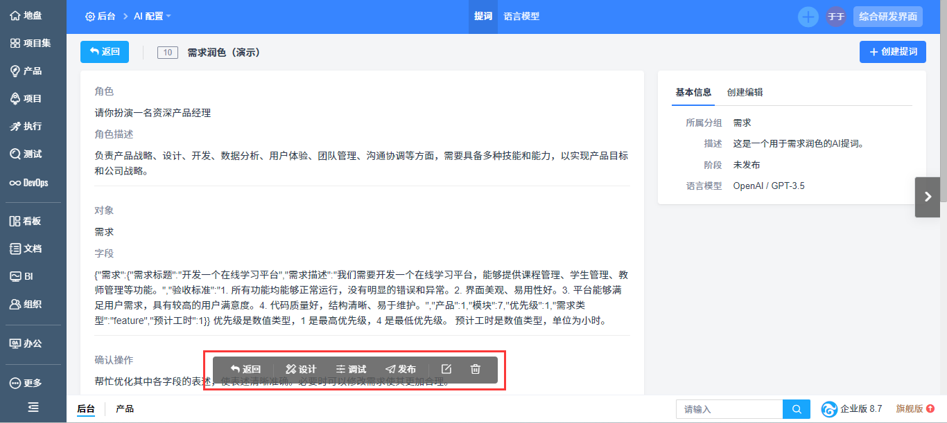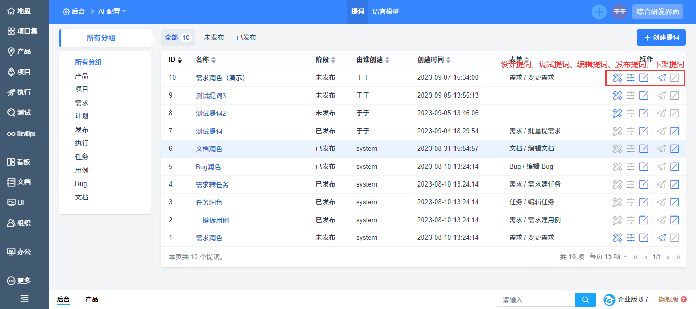 AI提词模块用于管理和设计提词。在提词列表页可以创建提词、查看提词详情、编辑提词、设计提词、调试提词、删除提词、阶段变更等操作。