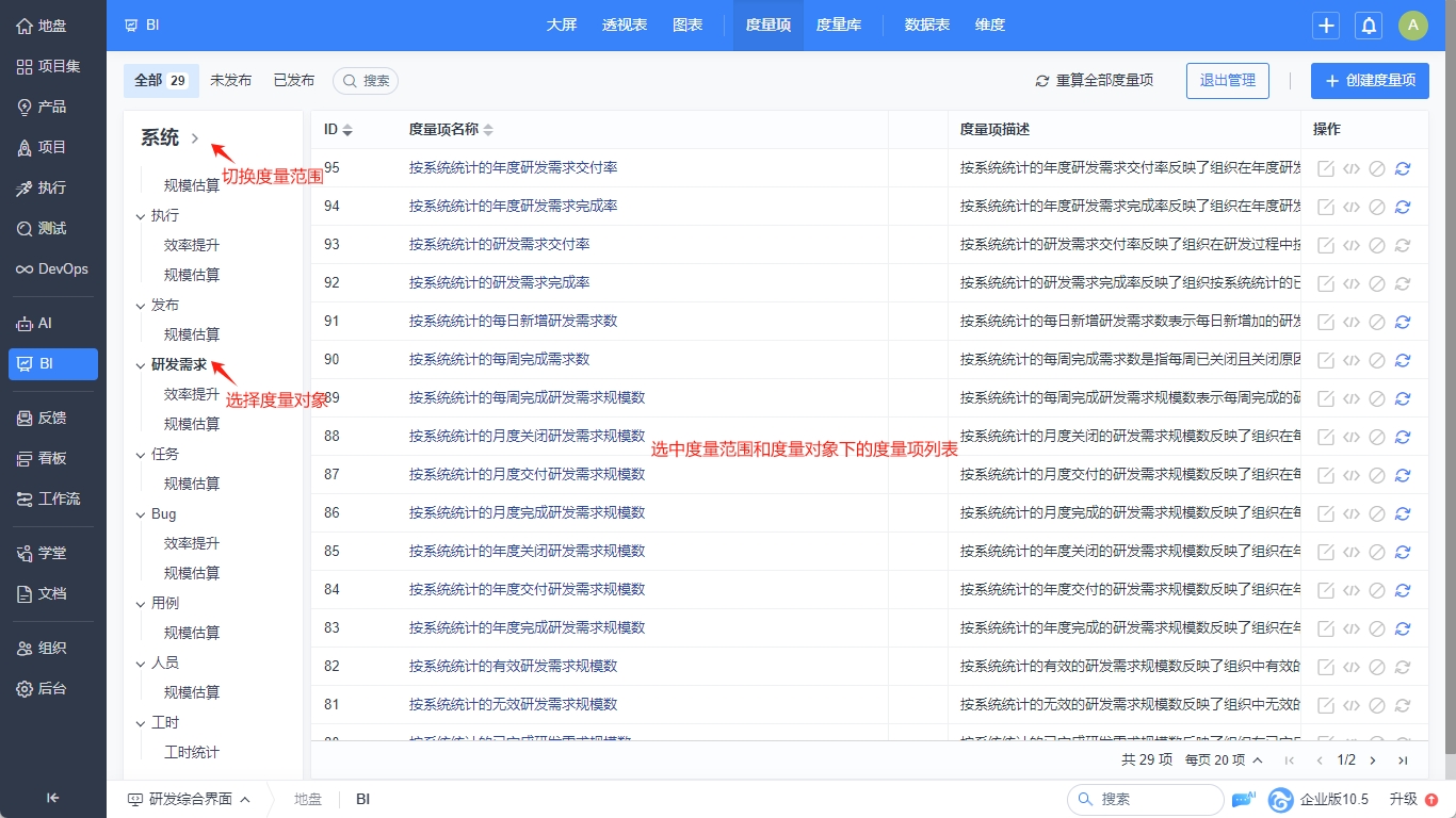 1.在度量项查看页面点击管理度量项进入度量项管理页面。