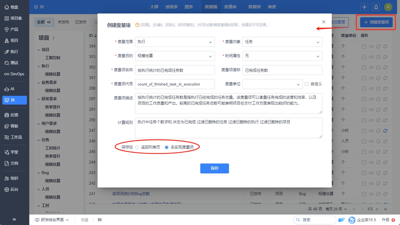 1.点击创建度量项按钮弹出创建度量项表单。