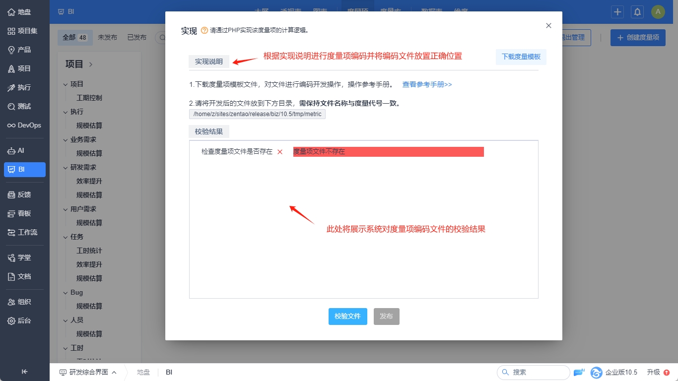 2.在该弹窗中根据实现说明中的操作步骤完成度量项的编码开发并将编码文件放置正确的目录下。