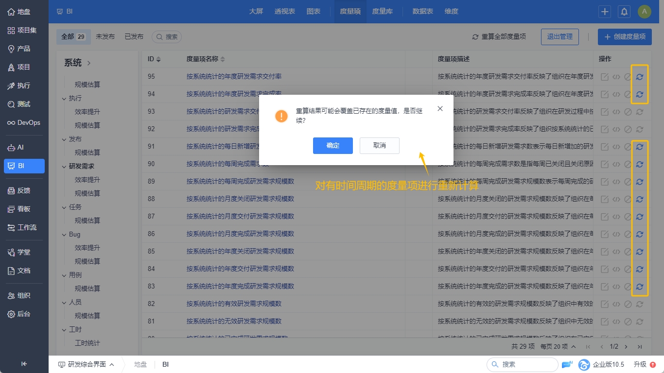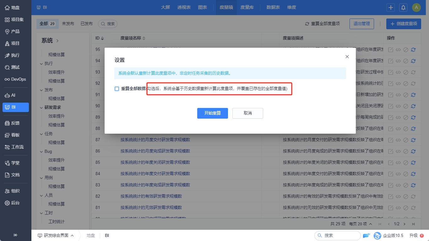 注意:重算度量项可能消耗一定资源或耗时较长,建议夜间或公司非生产时间段使用。