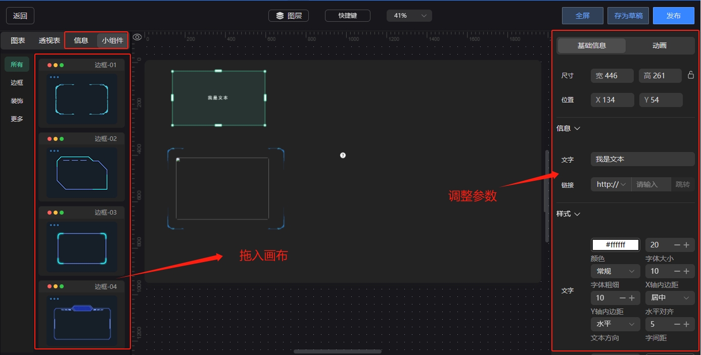 选中信息或小组件菜单下,将鼠标移至小组件的缩略图区域,即可拖入画布中,拖入后可在右侧配置区域调整小组件参数。