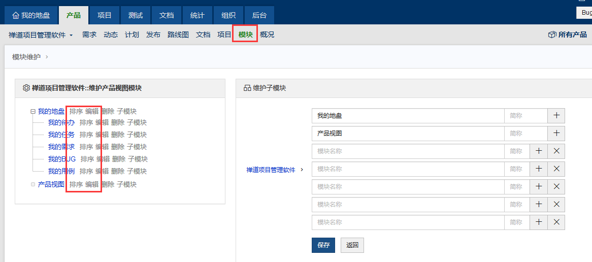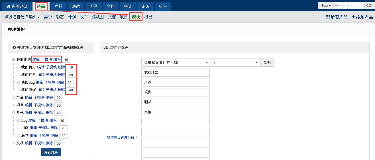 - 维护模块的时候是一级级进行维护的。比如可以选择"产品",然后维护它的子模块。