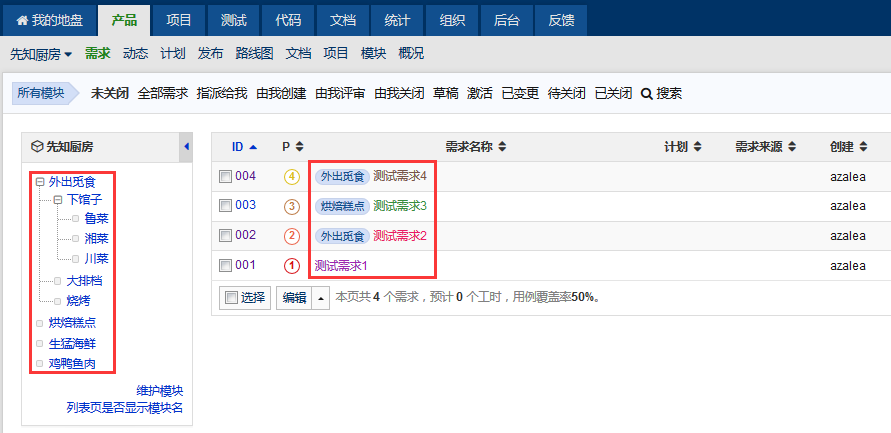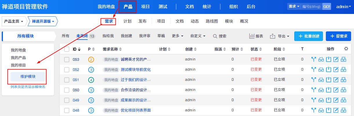 此外在产品---需求列表页左侧,也可以点击维护模块按钮来操作。