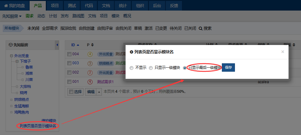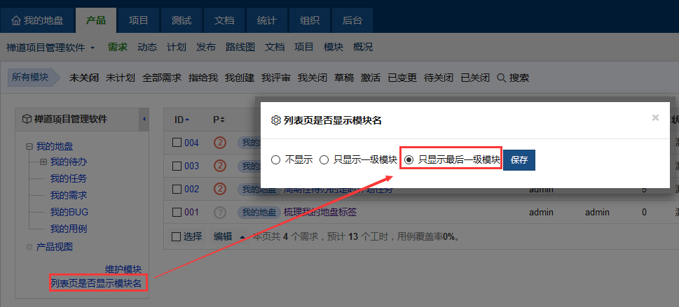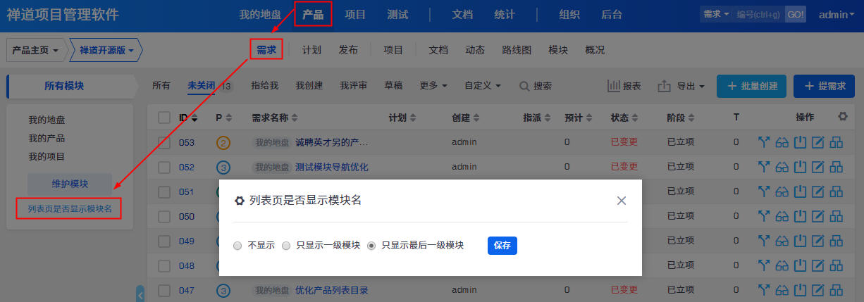 2、禅道里默认列表页不显示模块名,点击进入选择框,选择只显示一级模块。