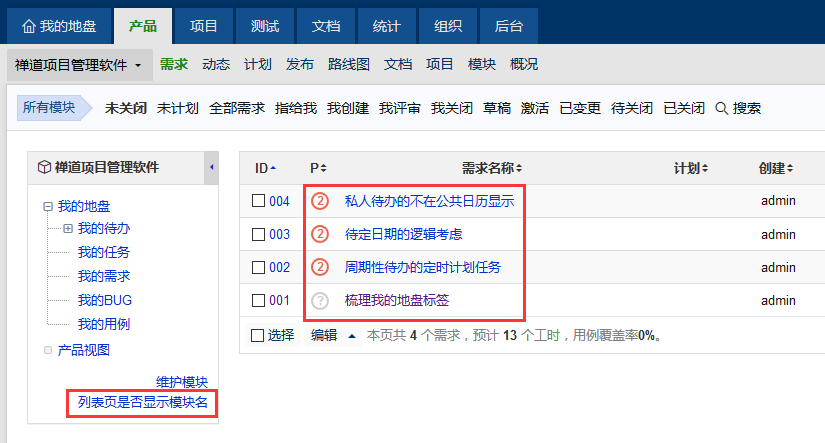 禅道支持列表页显示模块名的功能。(如果添加模块时有填写模块简称,那么就显示模块名简称。)