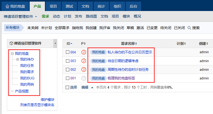 项目任务、测试Bug和用例也可以单独维护自己的模块。