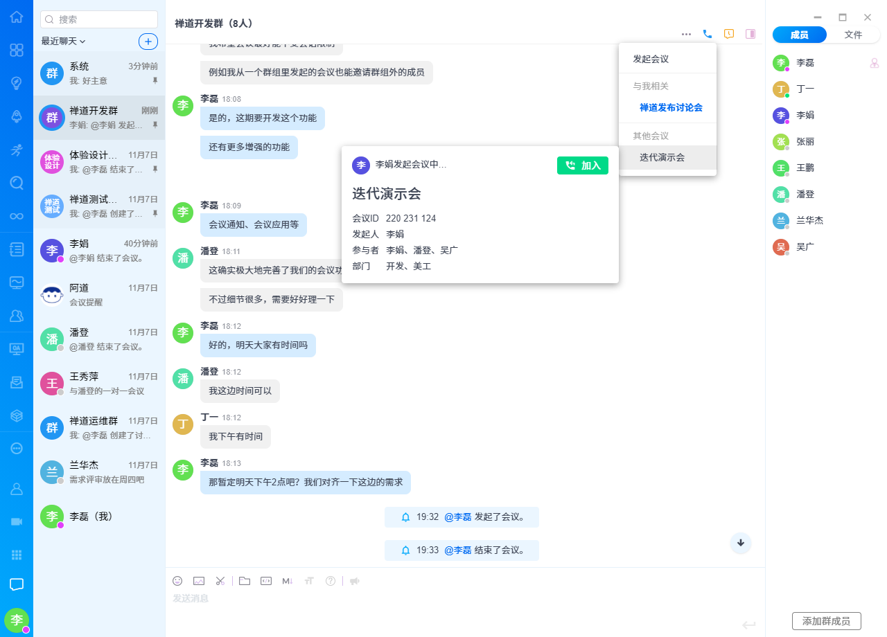 - 若受邀成员在发起会议的群组中,将在群组中收到会议邀请通知。