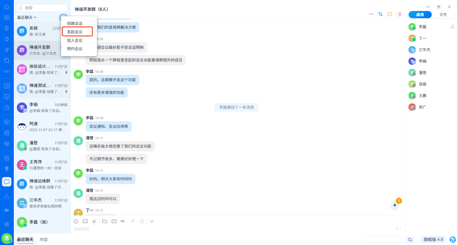 受邀用户均通过阿道通知,其他功能与上述会话发起的会议基本一致,这里不再赘述。