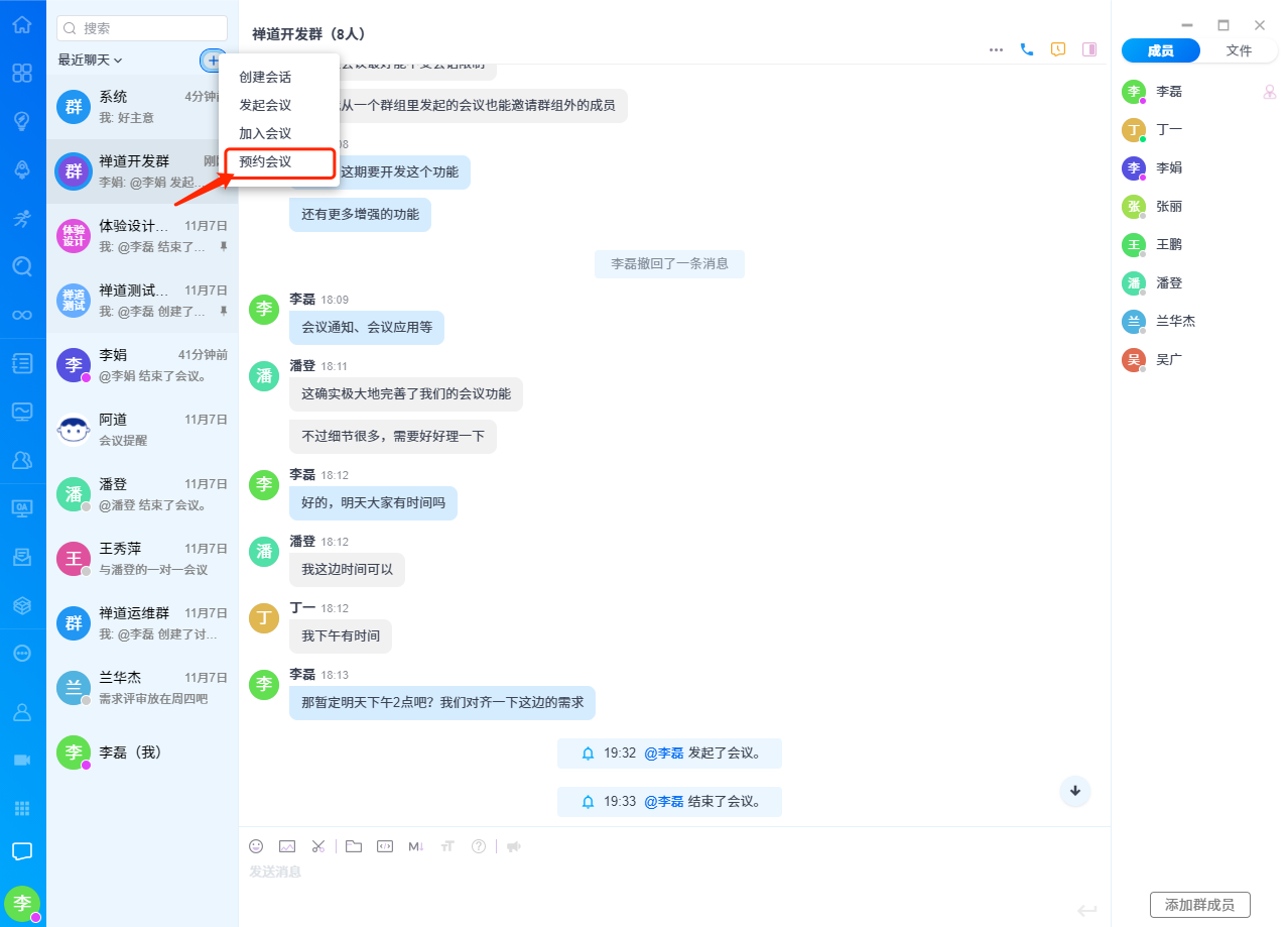 在禅道大桌面聊天界面中,点击左上角“+”显示菜单,用户点击预约会议或者在音视频会议应用界面顶部选择预约会议,显示预约会议设置页面。