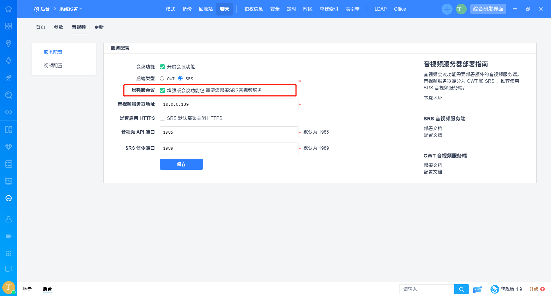 4. 开启增强版会议需要配置的后端类型为“SRS”。
