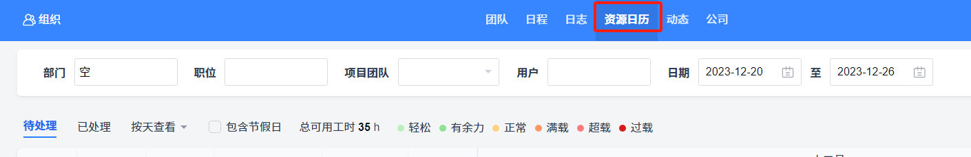 主要功能分资源日历、模拟负载两大部分功能。其中资源日历又分为资源日历页面、个人资源日历页面,这两个页面都包含待处理和已处理两种状态: