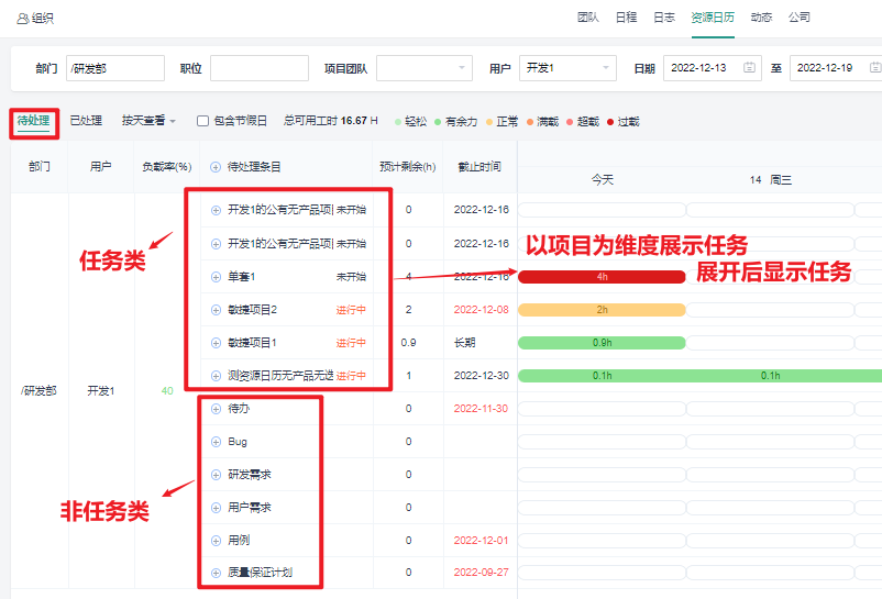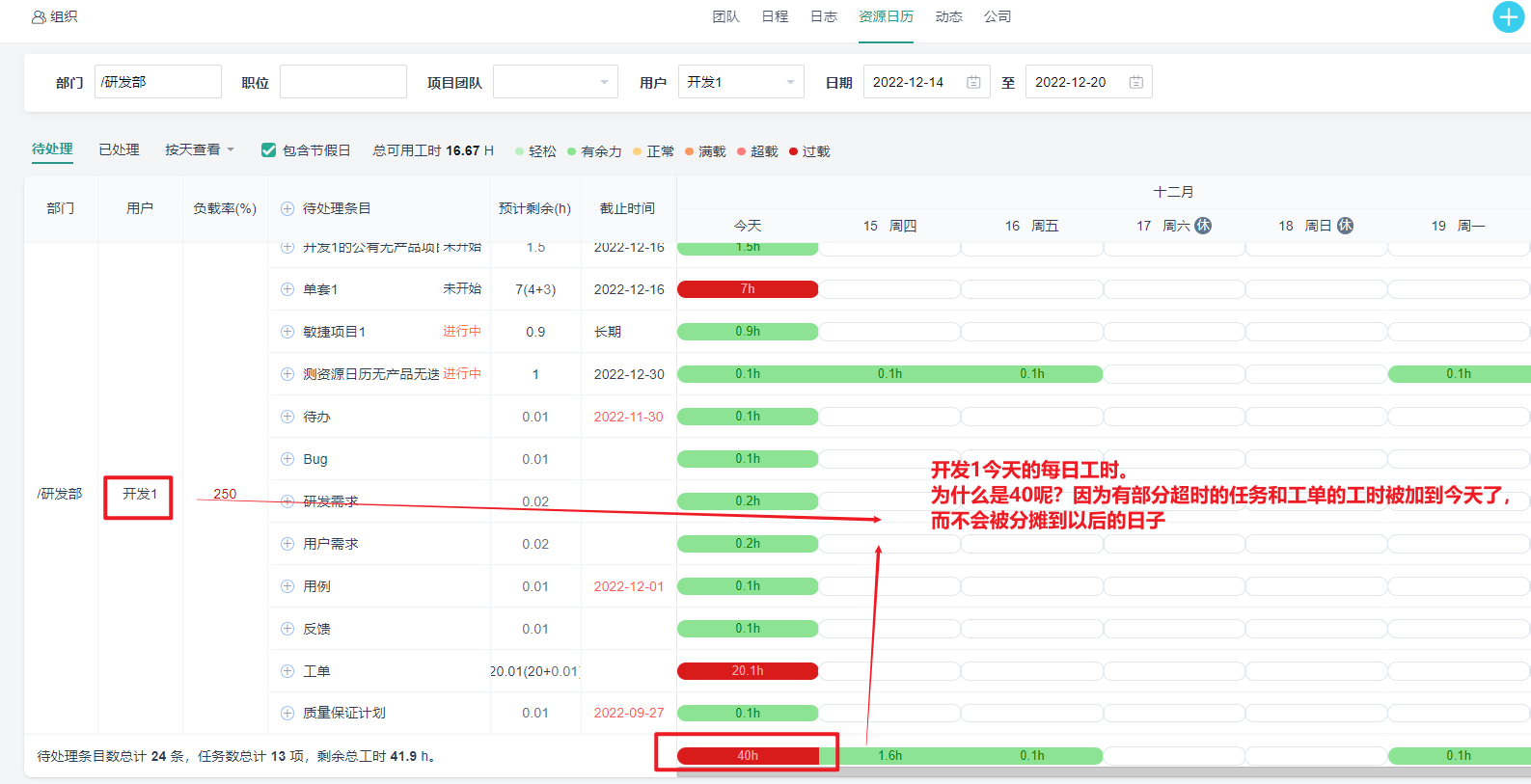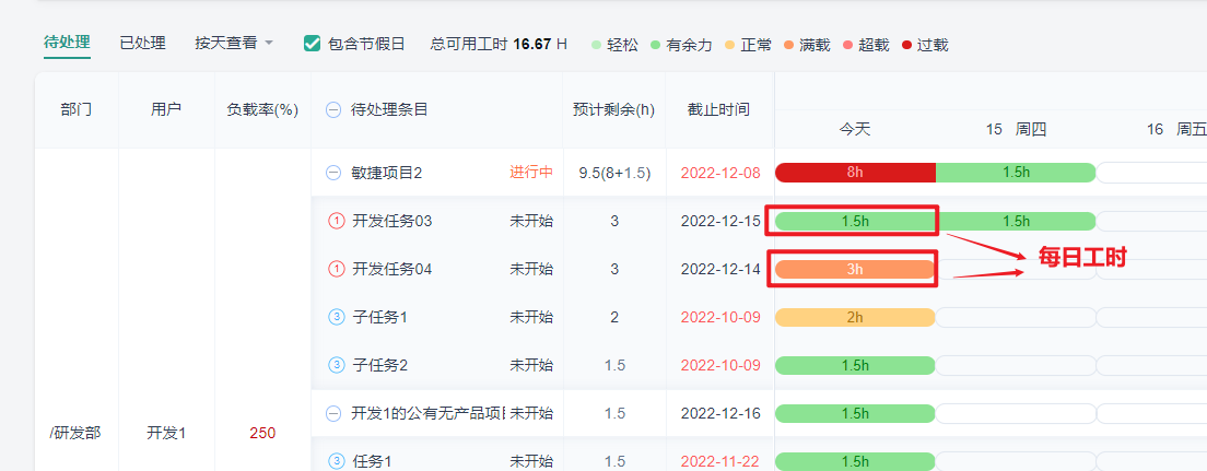 每天分摊工时=工时/工作日(若任务已超时会将该任务的工时算到当前工作日中)