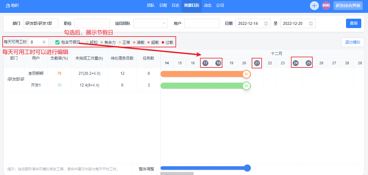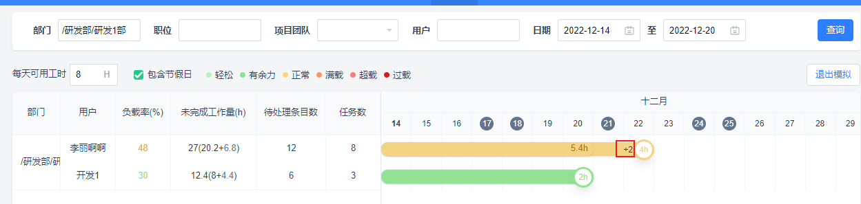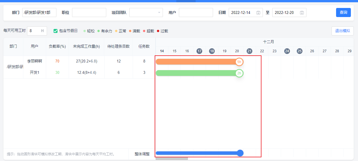 修改每天可用工时,页面中的负载率及滑块中的每天平均工时会依据计算逻辑同步改变。修改此处的每天可用工时不会影响到设置中的每天可用工时数值,仅在负载模拟页面同步查看整体负载变化情况。
