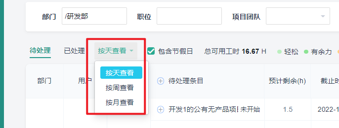 您可以在查询栏根据部门(多选)、职位(多选)、项目团队、用户(多选)和日期来进行筛选查询。