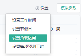 点击右上角的设置按钮,可以看到包含以下设置选项:设置工作时间、设置节假日、设置负载区间、设置每项预测工时。