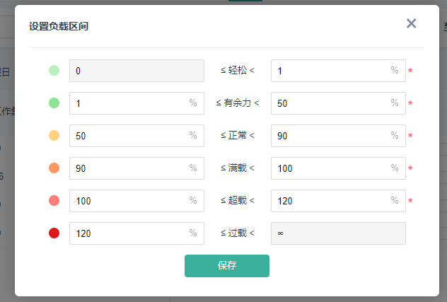 4.3 设置负载区间页面可设置负载率所对应的区间,不同区间颜色显示不同。只能填写三位正整数,区间联动。
