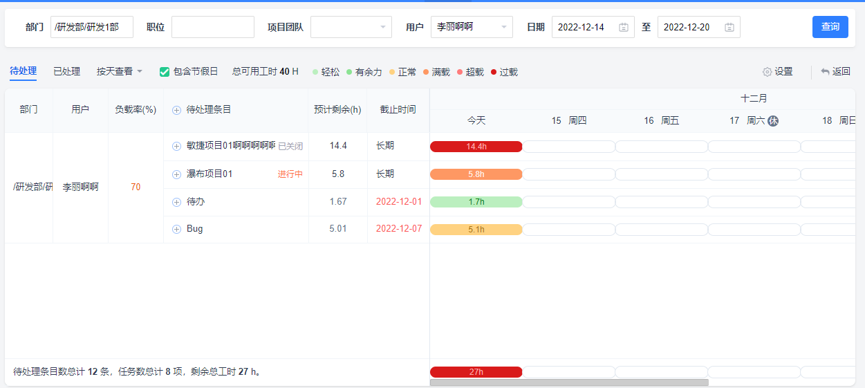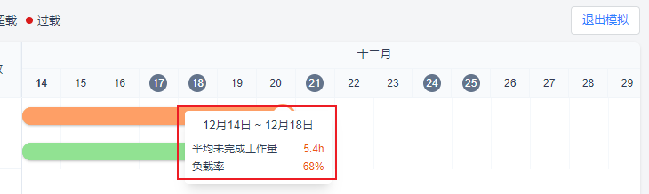 鼠标悬停在日期条上浮窗展示具体日期区间、平均未完成工作量、负载率。