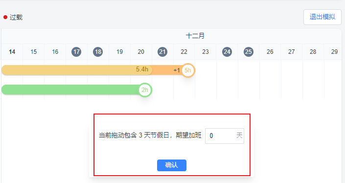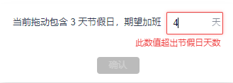 拖动个人滑块或整体滑块时,若拖动的日期内包含节假日,会弹窗提示期望加班天数,默认显示为0,输入的天数大于实际节假日天数时会给出提示信息。