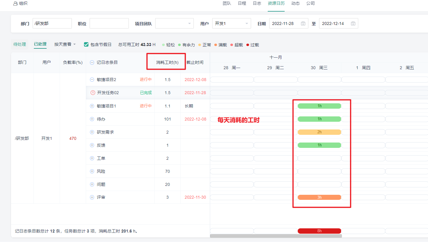 消耗总工时:将所选时间内,待办项填写日志的工时之和对应展示出来。