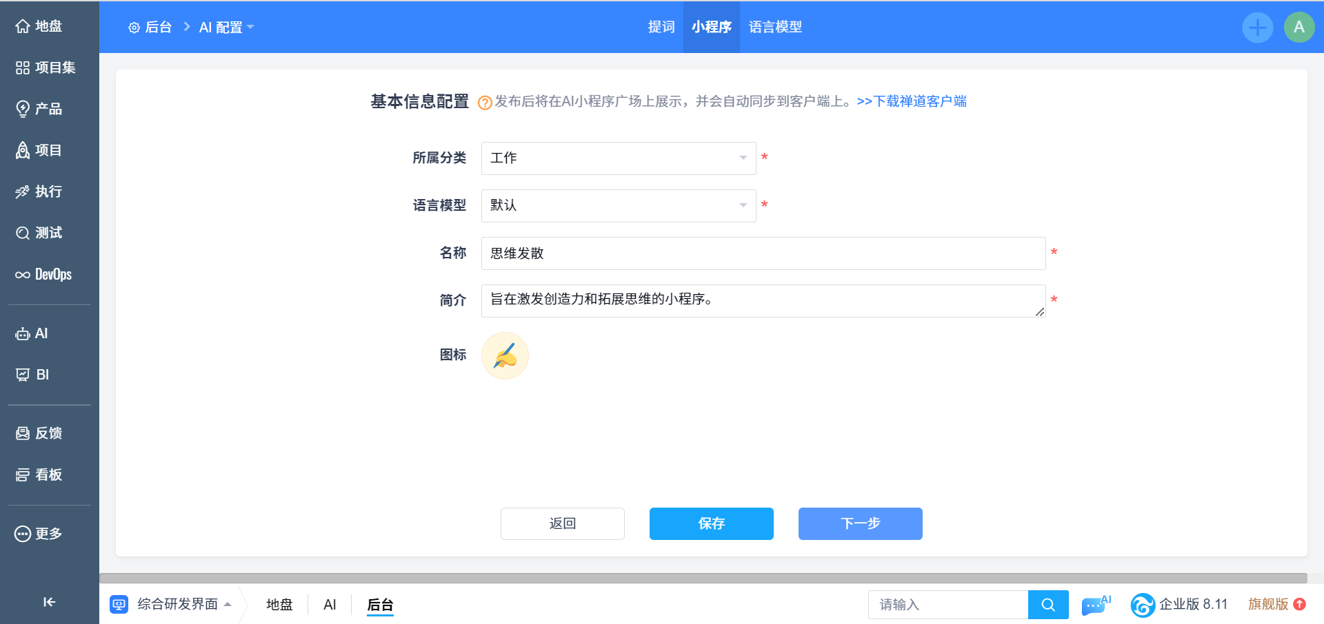 新增AI小程序分两个步骤,分别为配置小程序基本信息和配置表单、提词等信息。第一步配置AI小程序基础信息包括分类、应用的语言模型、名称、简介、图标内容。