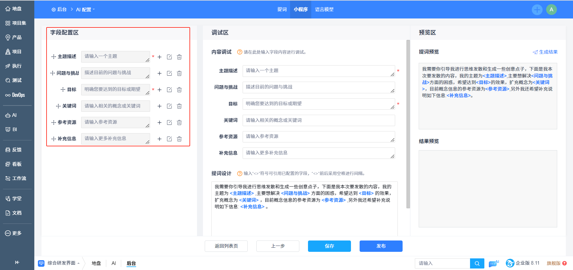 第二步配置AI小程序表单和提词信息,包括字段配置、提词模板、调试内容、提词预览、结果预览,保存后即可完成AI小程序设计。