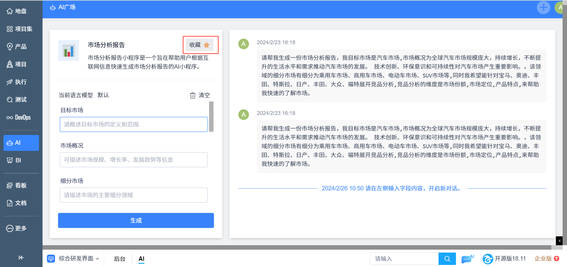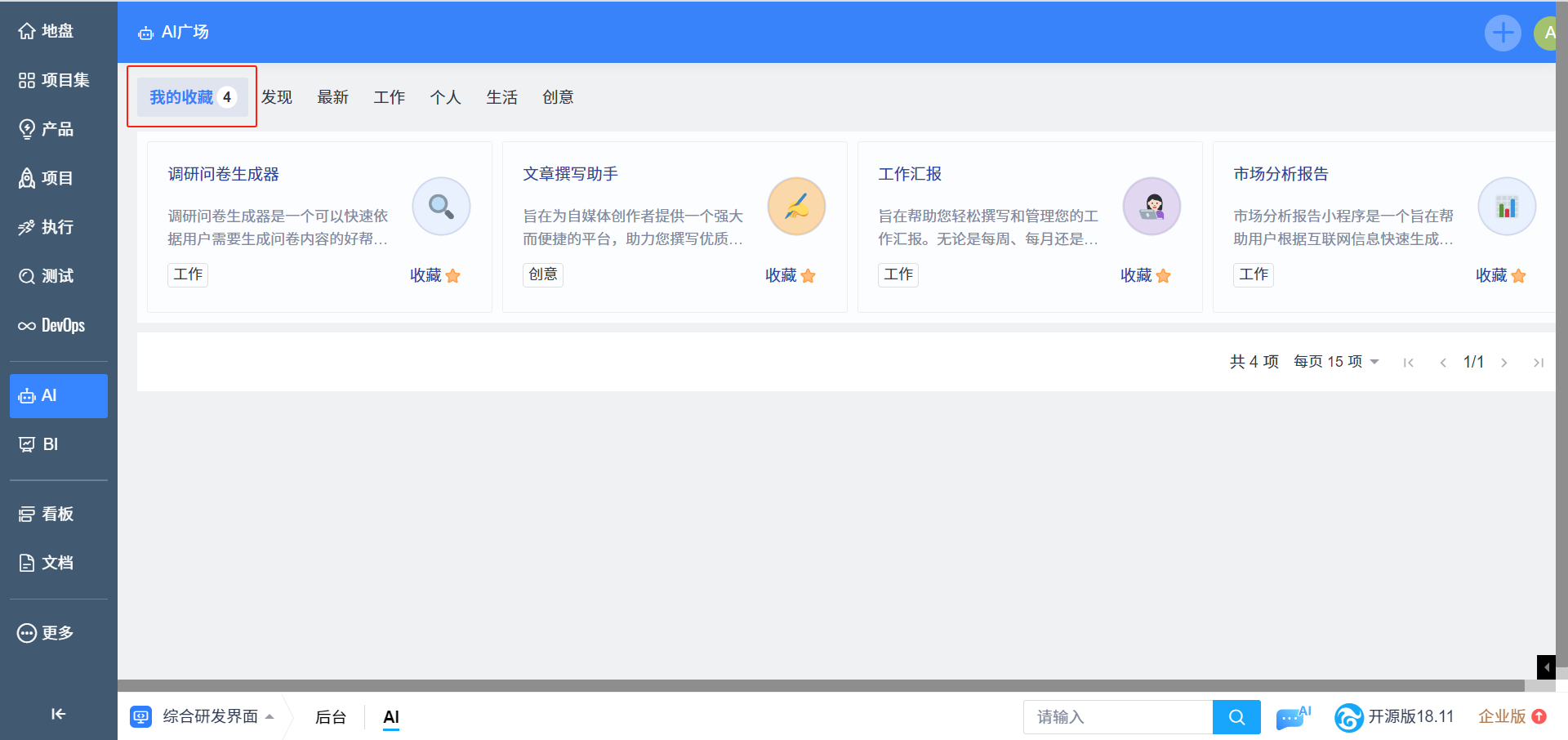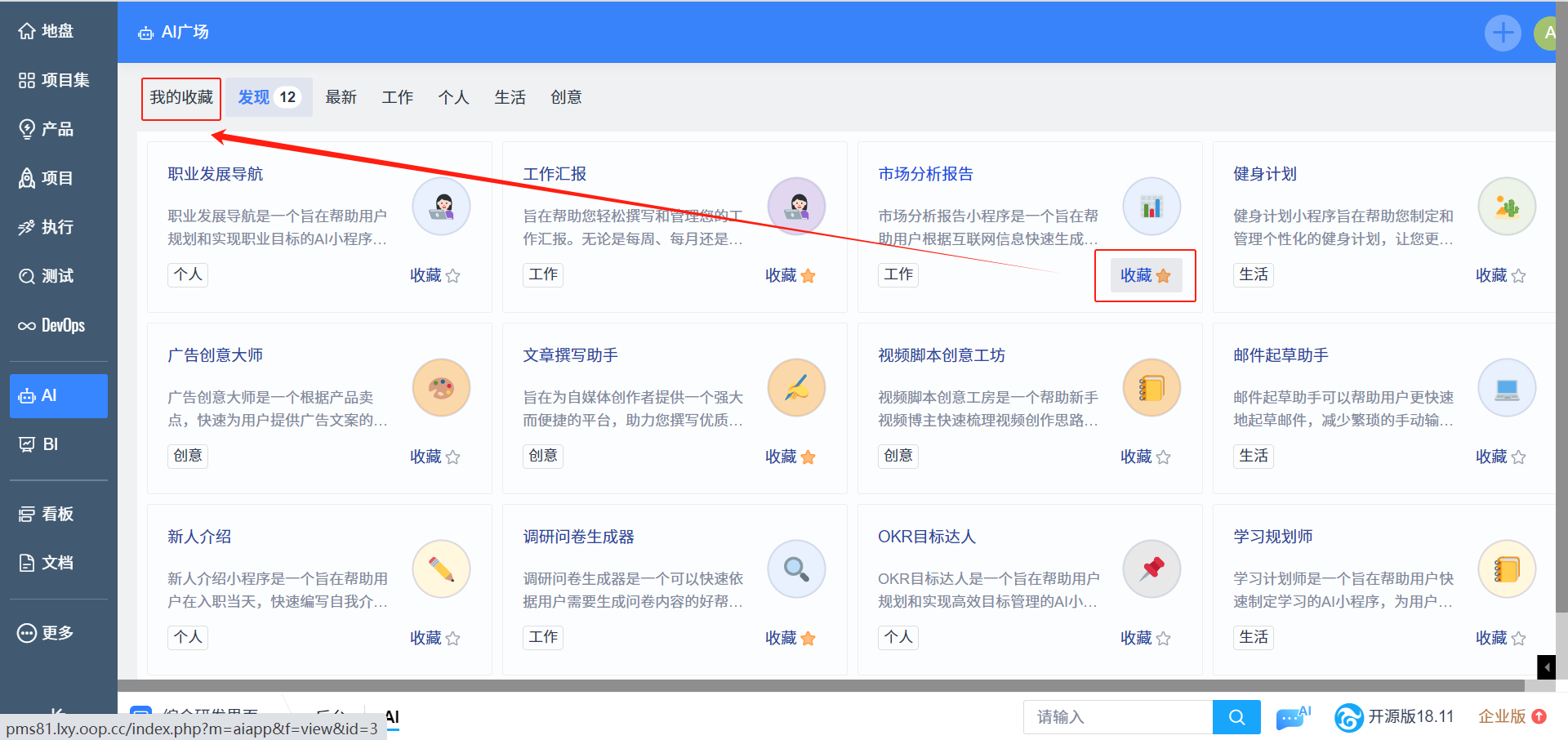 1. 左侧新增一级导航【AI】,点击后进入AI小程序广场,可查看内置12个AI小程序,支持按类别查看。同时企业版、旗舰版、IPD版本后台配置发布后的小程序会在【发现】标签下显示。