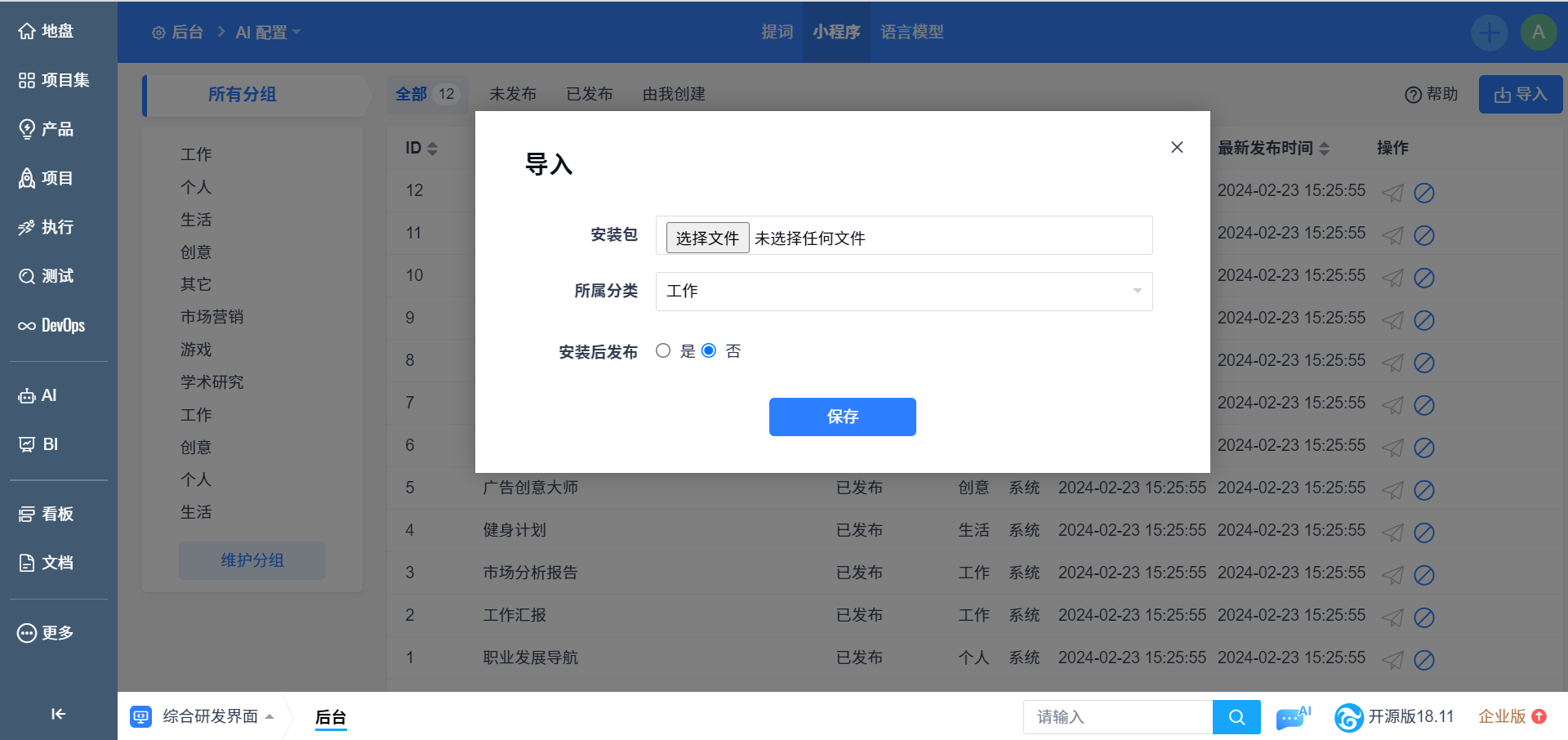 2. 点击后台小程序列表右上方【导入】按钮,选择对应文件,选择小程序所属分类和发布状态。