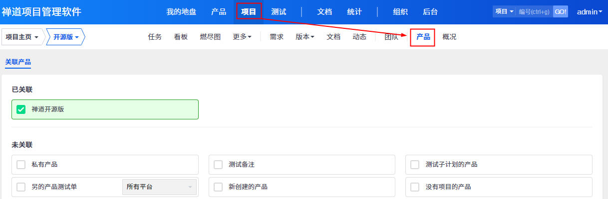 - 点击“关联产品”按钮。然后点选该项目相关的产品即可。