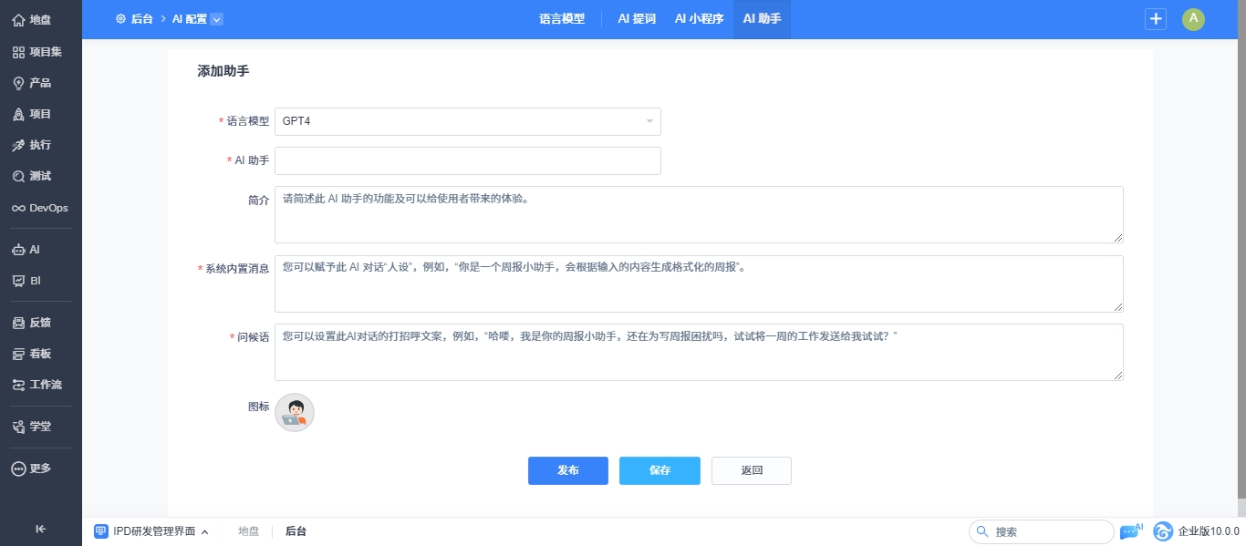 进入AI助手列表页点击右上角添加助手,进入添加助手表单页面。
