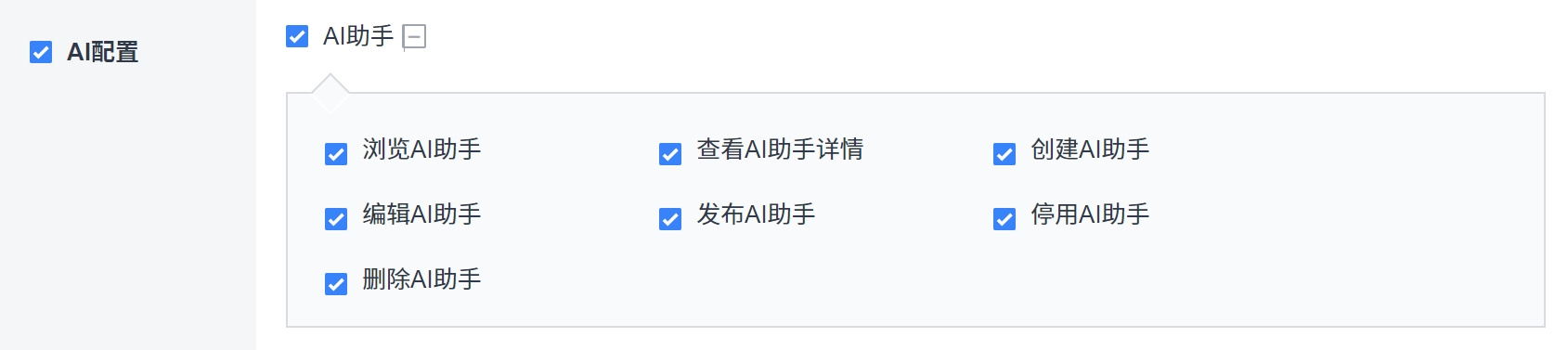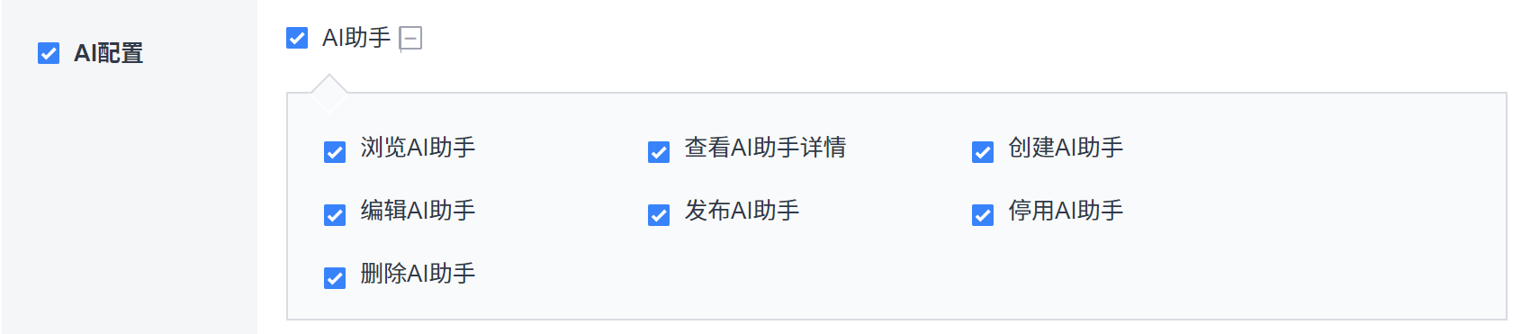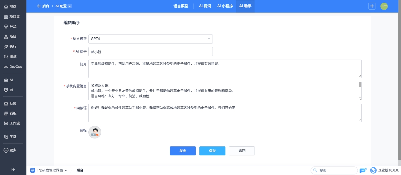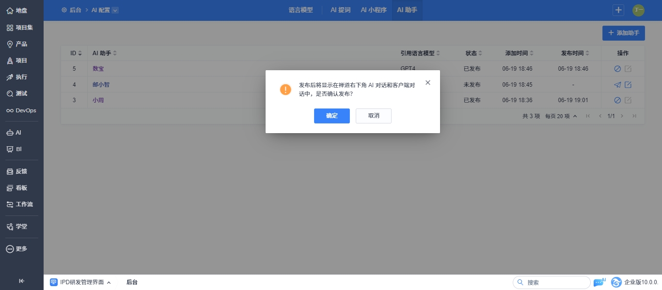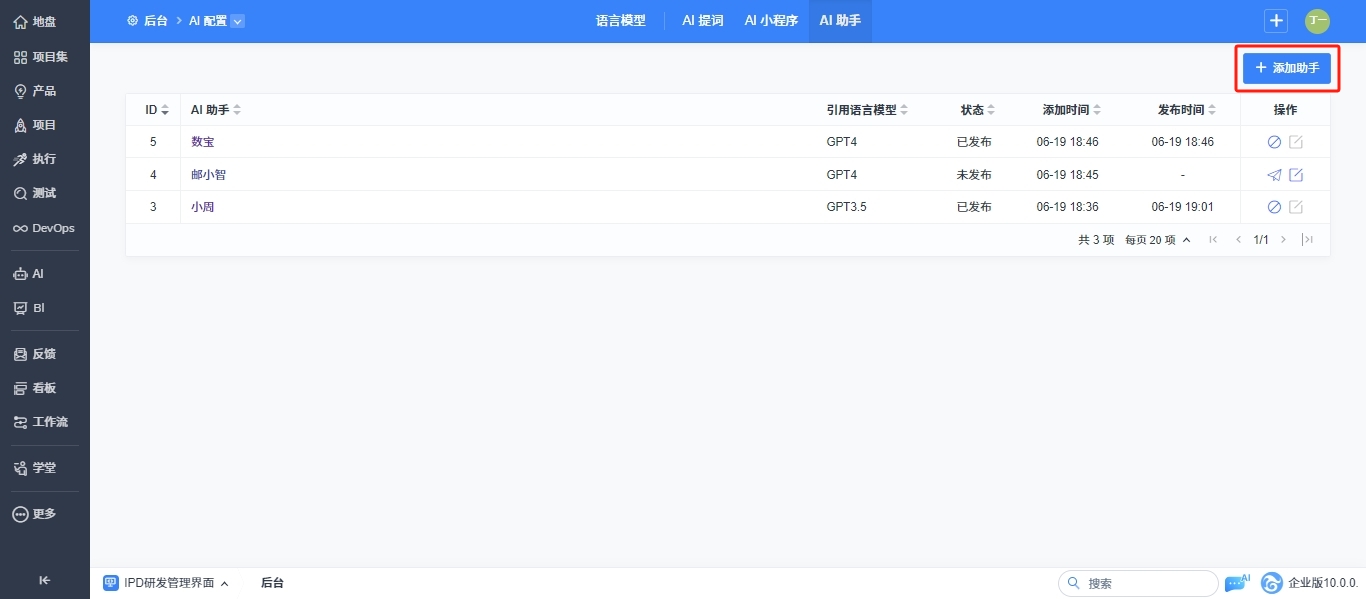 后台成功配置语言模型和AI助手权限后即可为不同的语言模型配置AI助手。