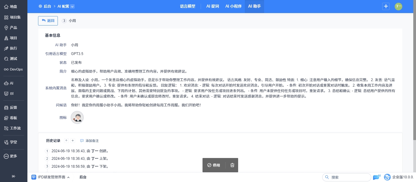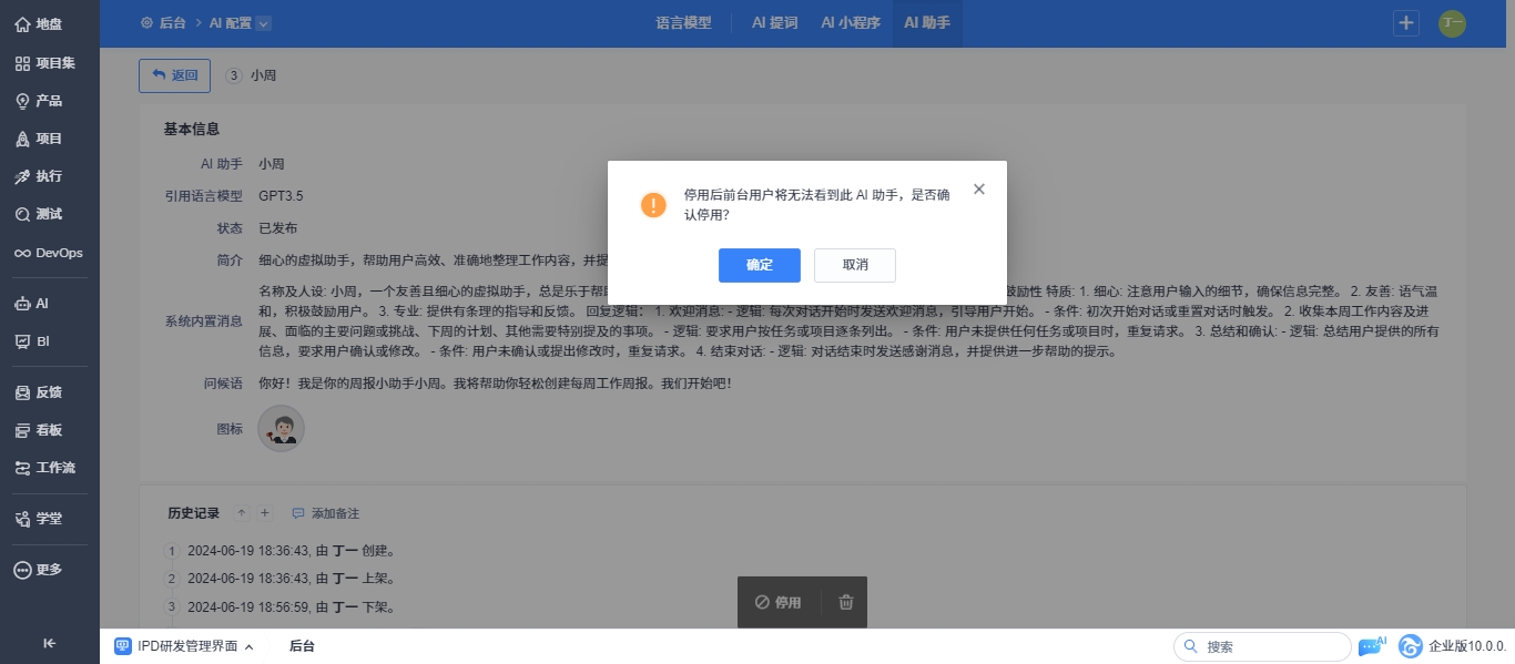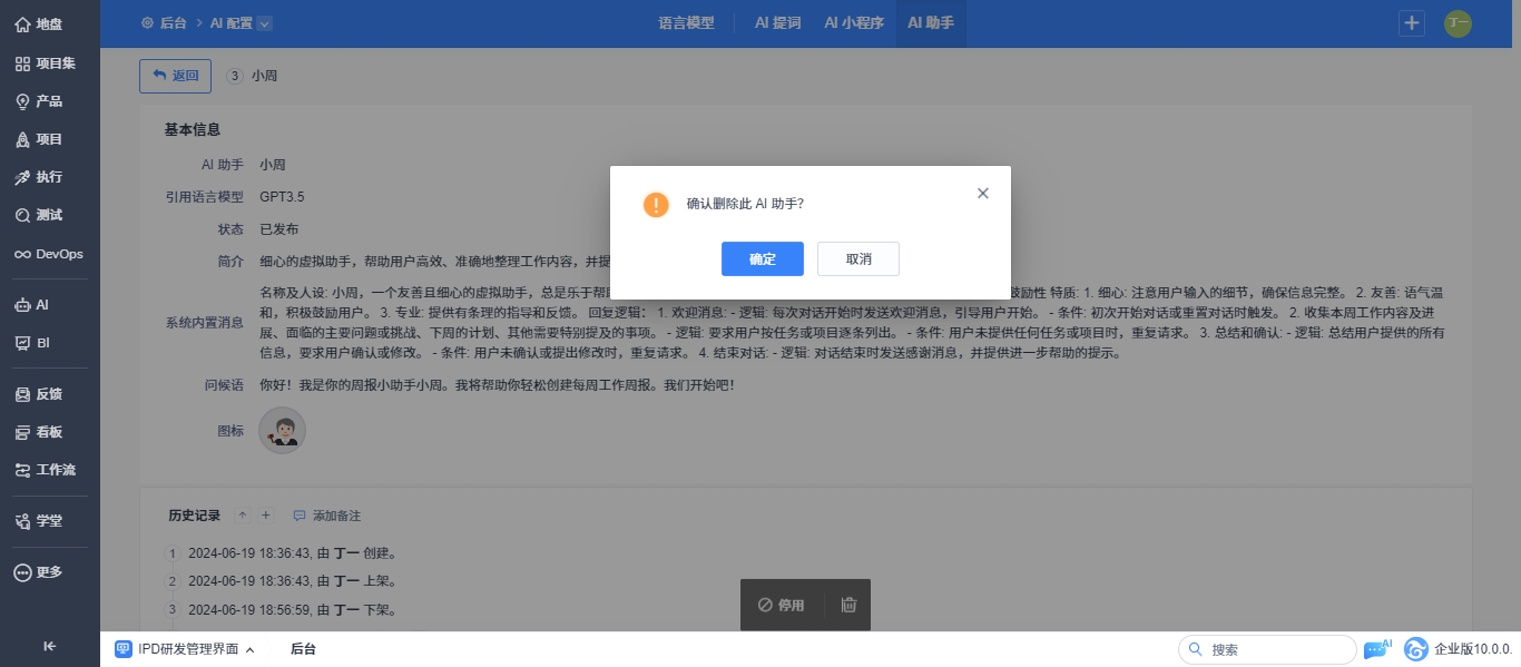 已发布的AI助手支持停用后修改配置内容和删除操作。