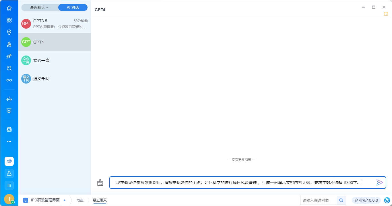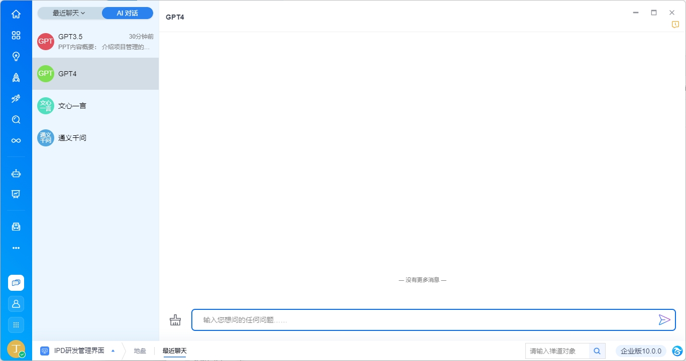 若当前语言模型下配置了多个AI助手,则在对话界面右侧展示AI助手列表。全能助手为语言模型本身,其他助手为后台配置发布的AI助手。